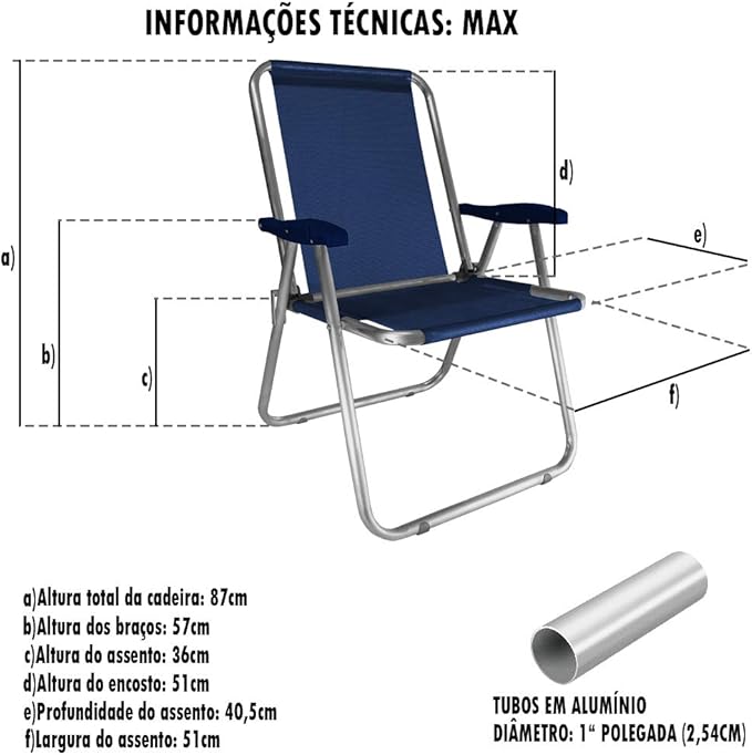 A Cadeira Max Alumínio tem seus principais diferenciais a largura e a altura, é indicada para pessoas com até 140kg, mais altas ou com sobrepeso. Fabricada em alumínio de alta resistência e que não enferruja, tecido BMDNET, soldado eletronicamente, sem costuras. Braços injetados. Atende perfeitamente públicos PLUS SIZE e OVERSIZE. Possui proteção que não risca o chão. Além disso, pode ser utilizada em diversos ambientes, como praia, camping e jardim, proporcionando ótimos momentos de lazer. Diferencial: a marca ZAKA é reconhecida por ser uma marca de qualidade. Todos os produtos são revisados e testados. A cadeira Max é maior e mais resistente. Utilizamos os melhores componentes e insumos do mercado.