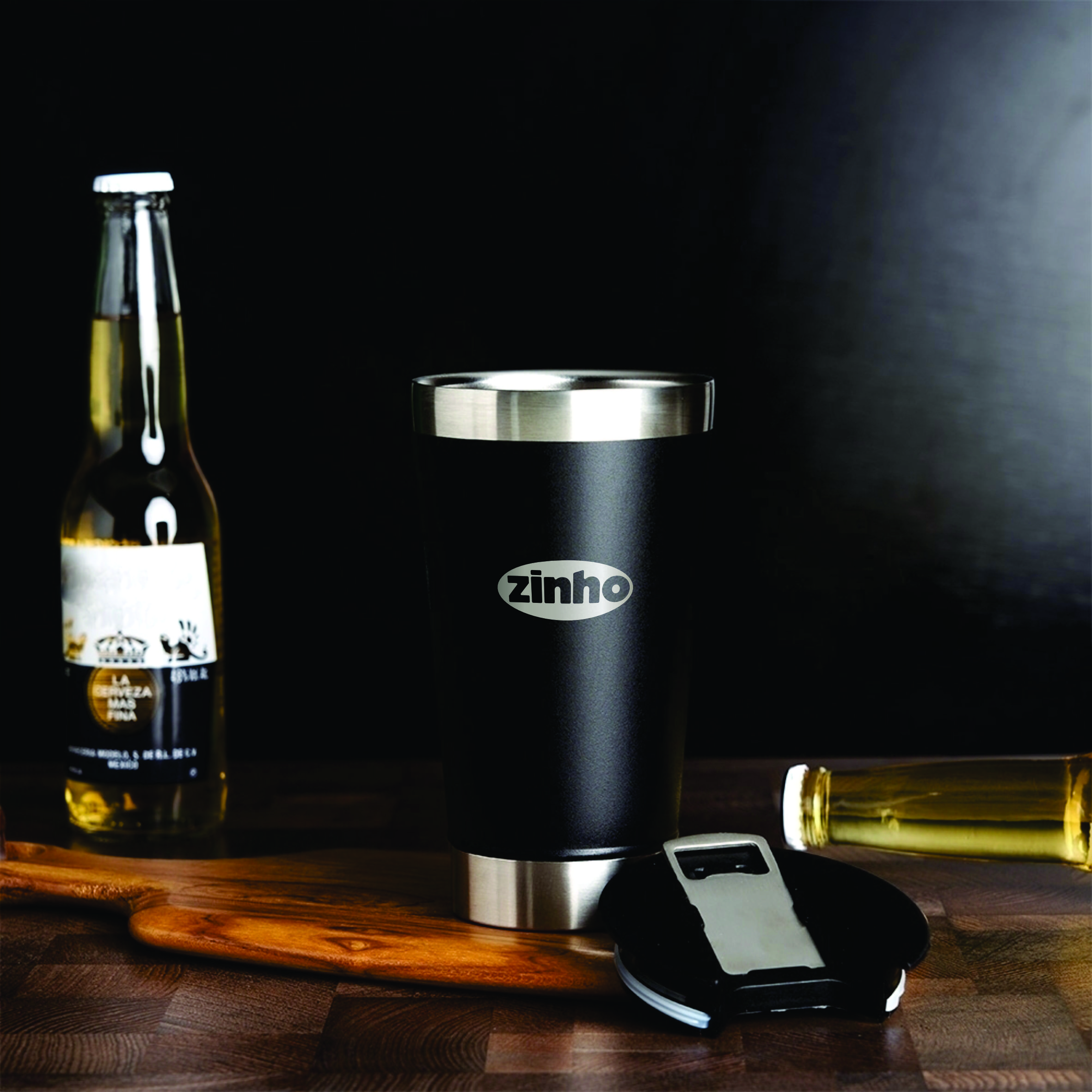 Copo térmico de inox com acabamento liso e capacidade 500ml, material livre de BPA. Contém tampa com abridor.