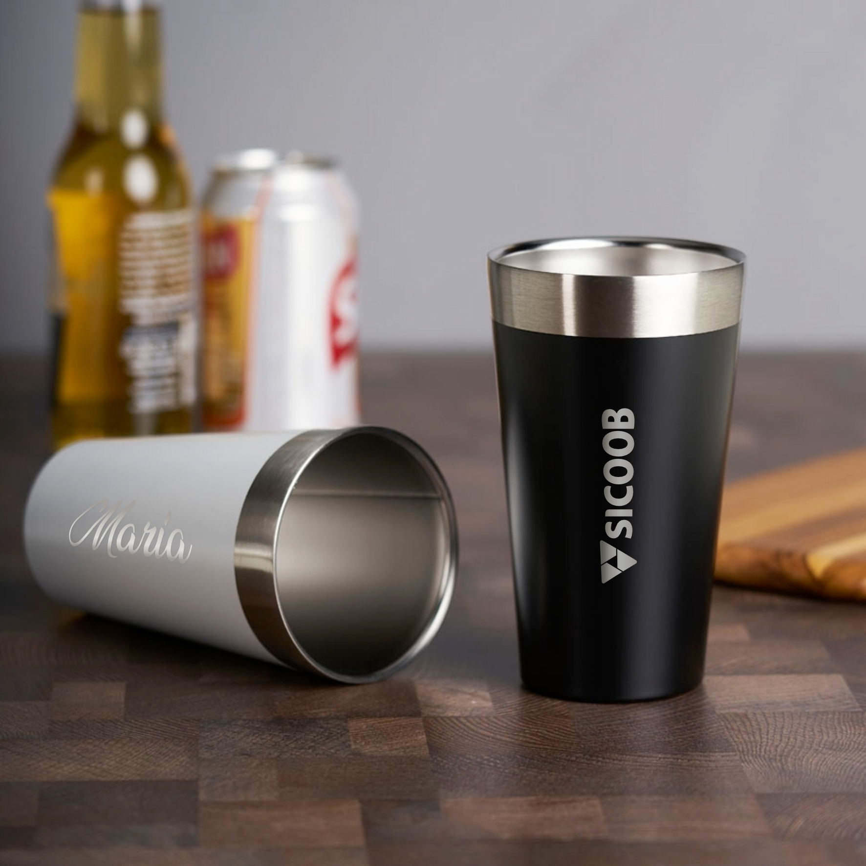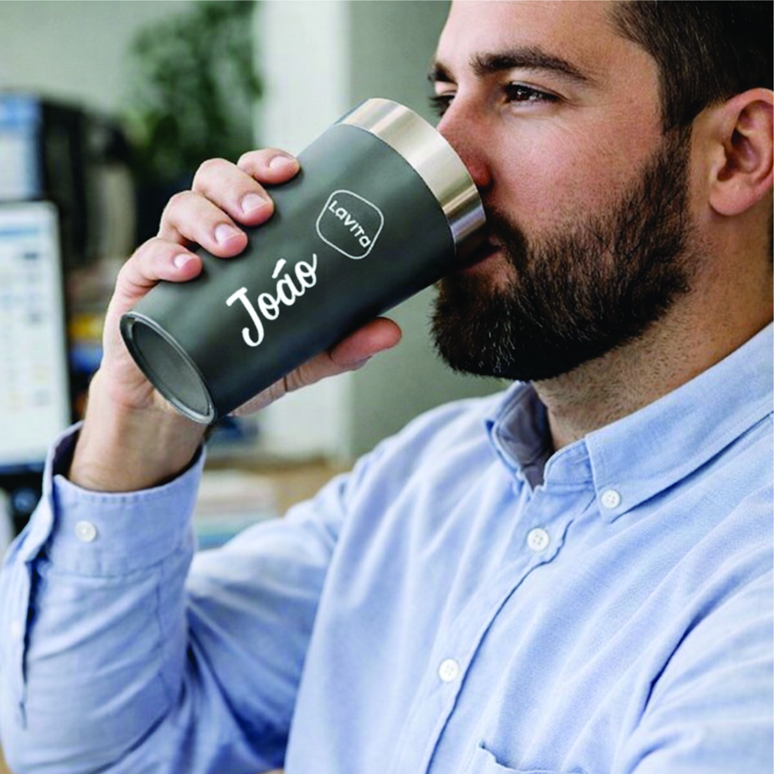 Copo térmico de inox com capacidade para 473ml. Produto livre de BPA.