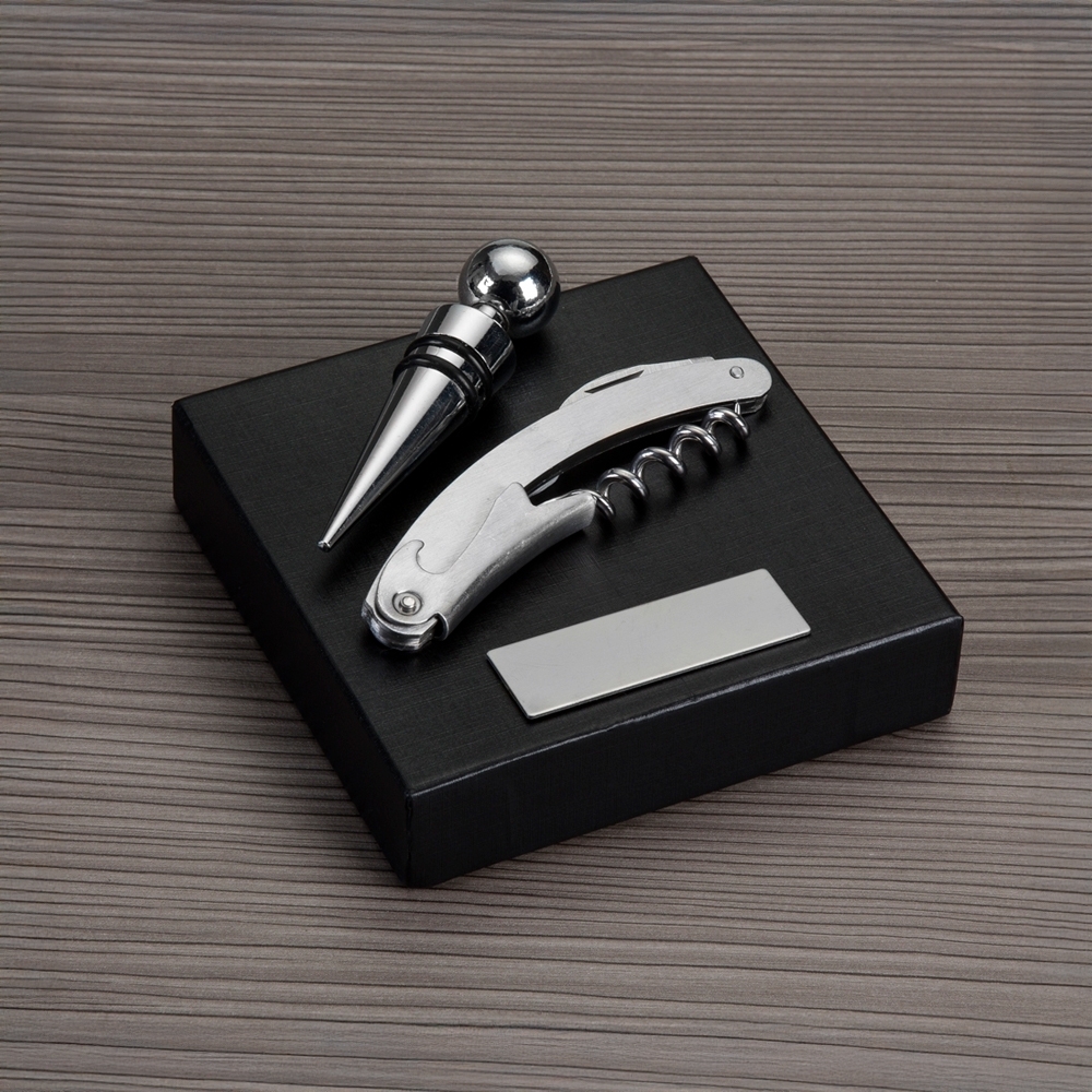 Kit vinho 2 peças em estojo com tampa, contém saca-rolhas metálico com lâmina de corte e abridor de garrafa e tampa de bico. Área interna do estojo com berço de espuma. Acompanha plaquinha metálica para personalização.