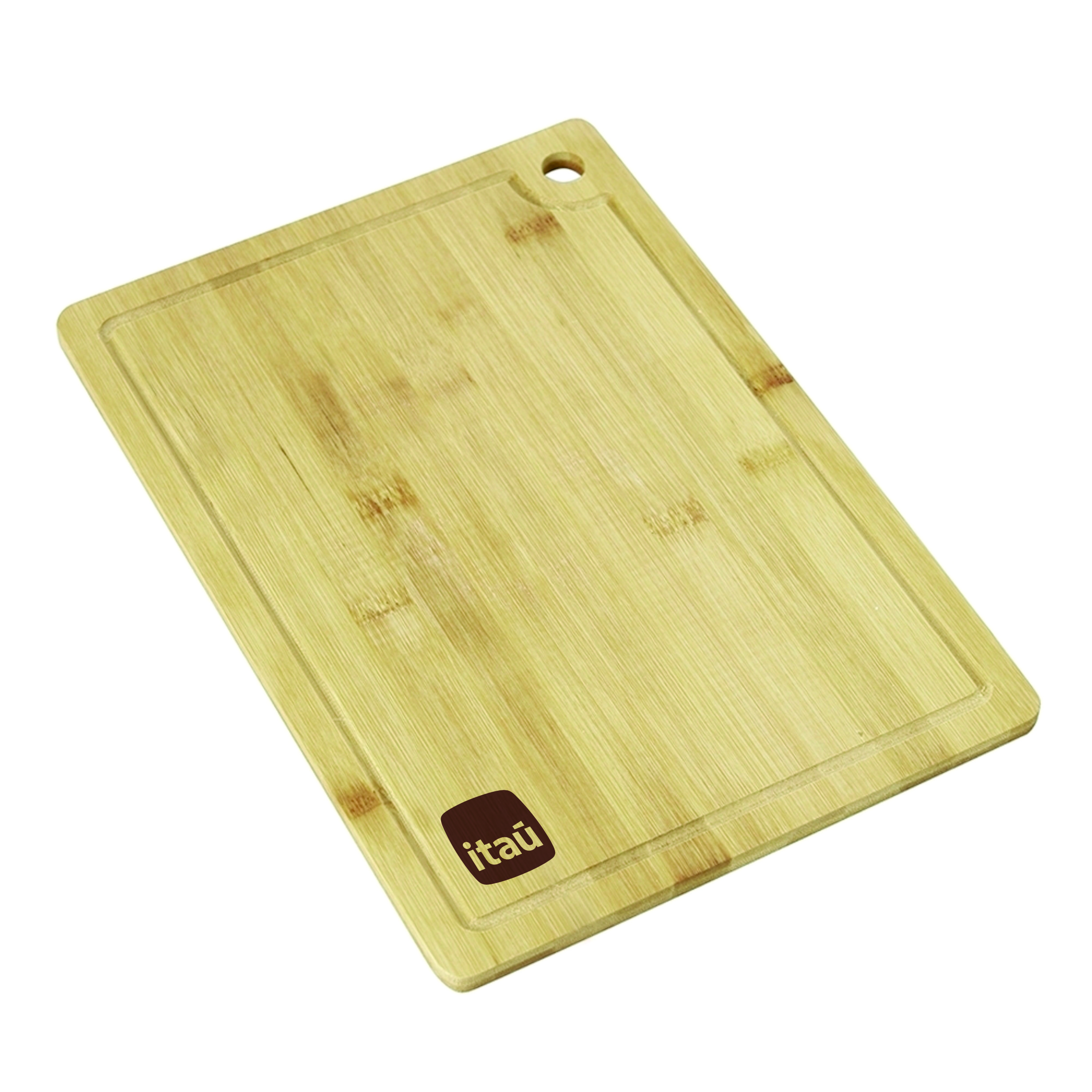 Tábua de corte em bambu com canaleta e acesso para gancho.