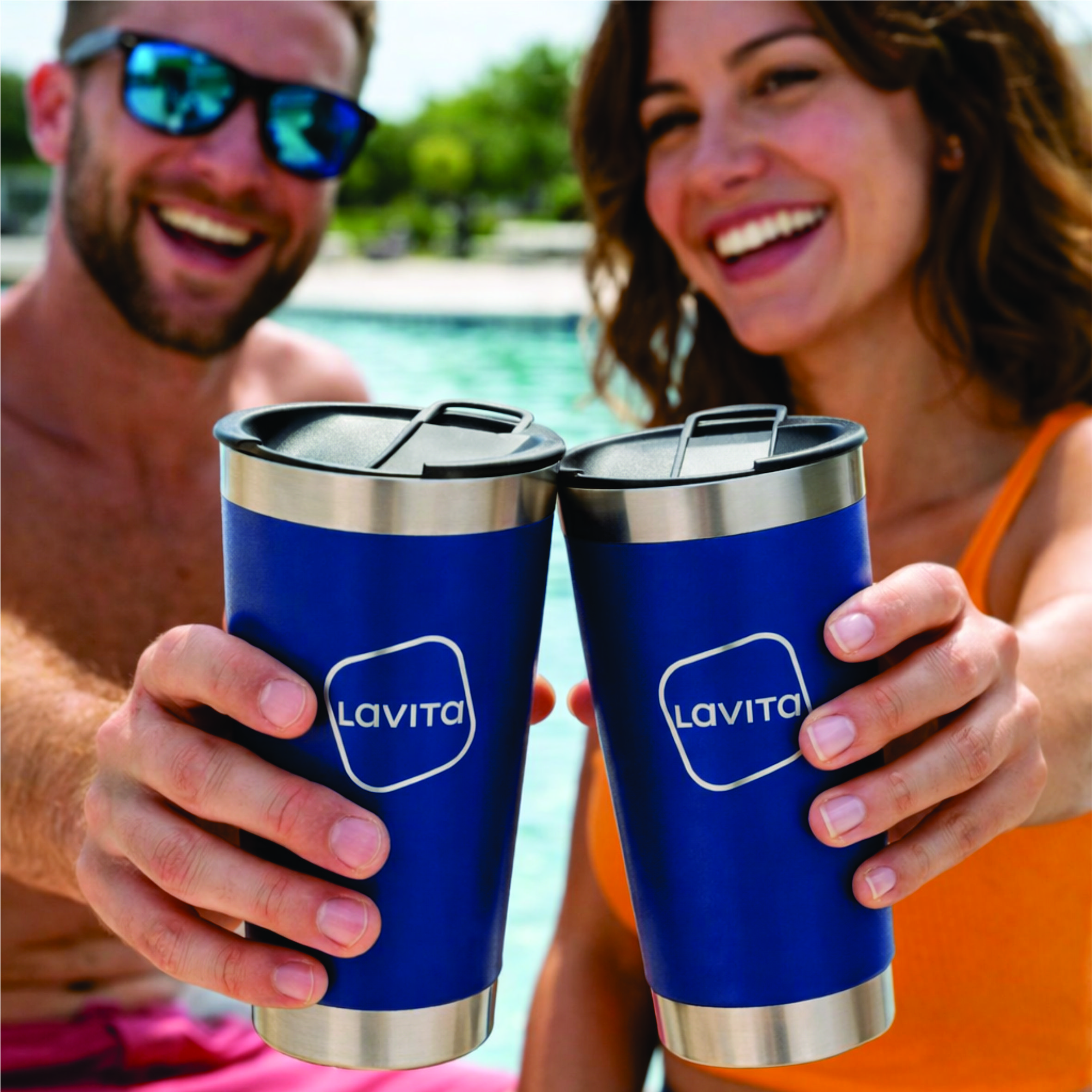 Copo térmico de inox com acabamento liso e capacidade 500ml, material livre de BPA. Contém tampa com abridor.